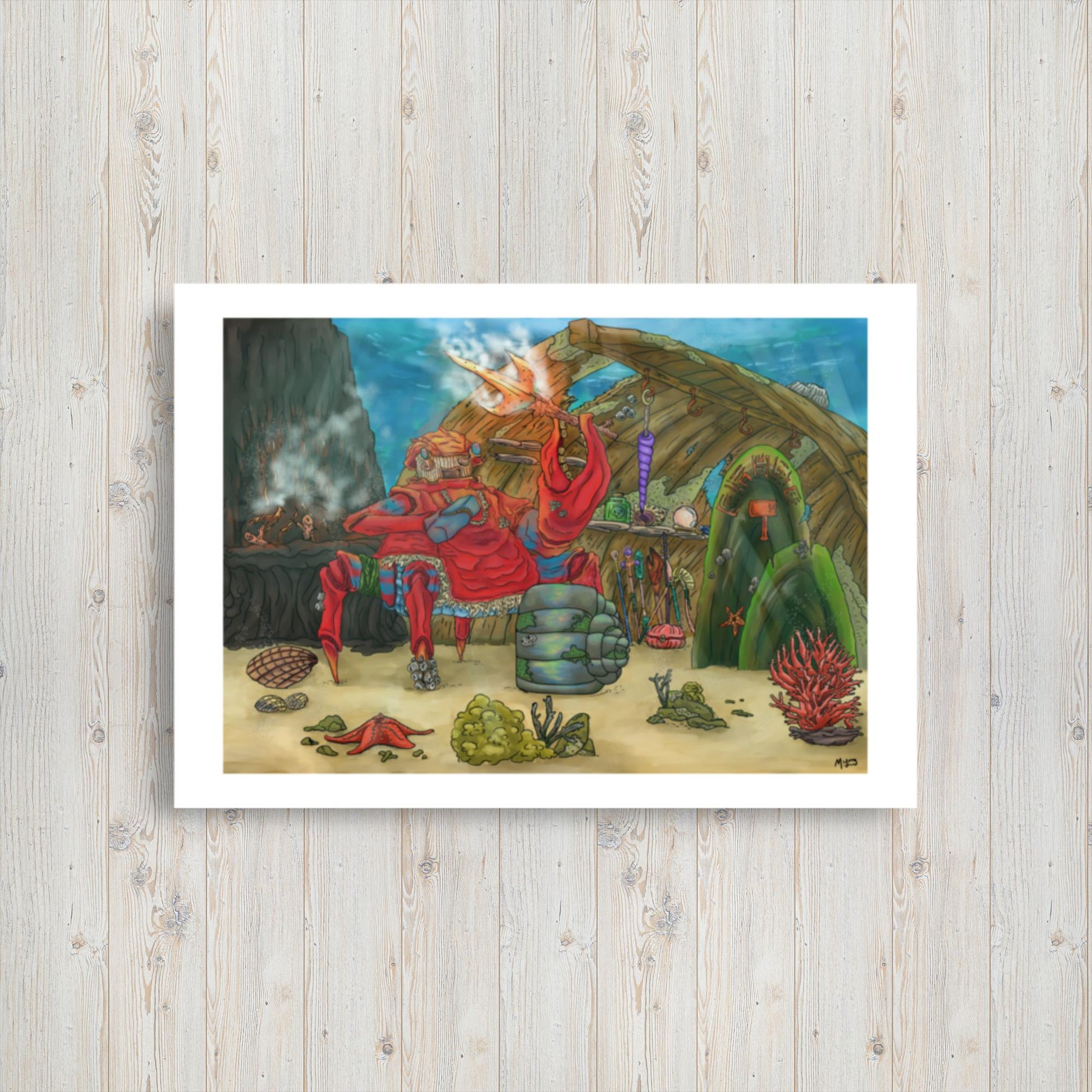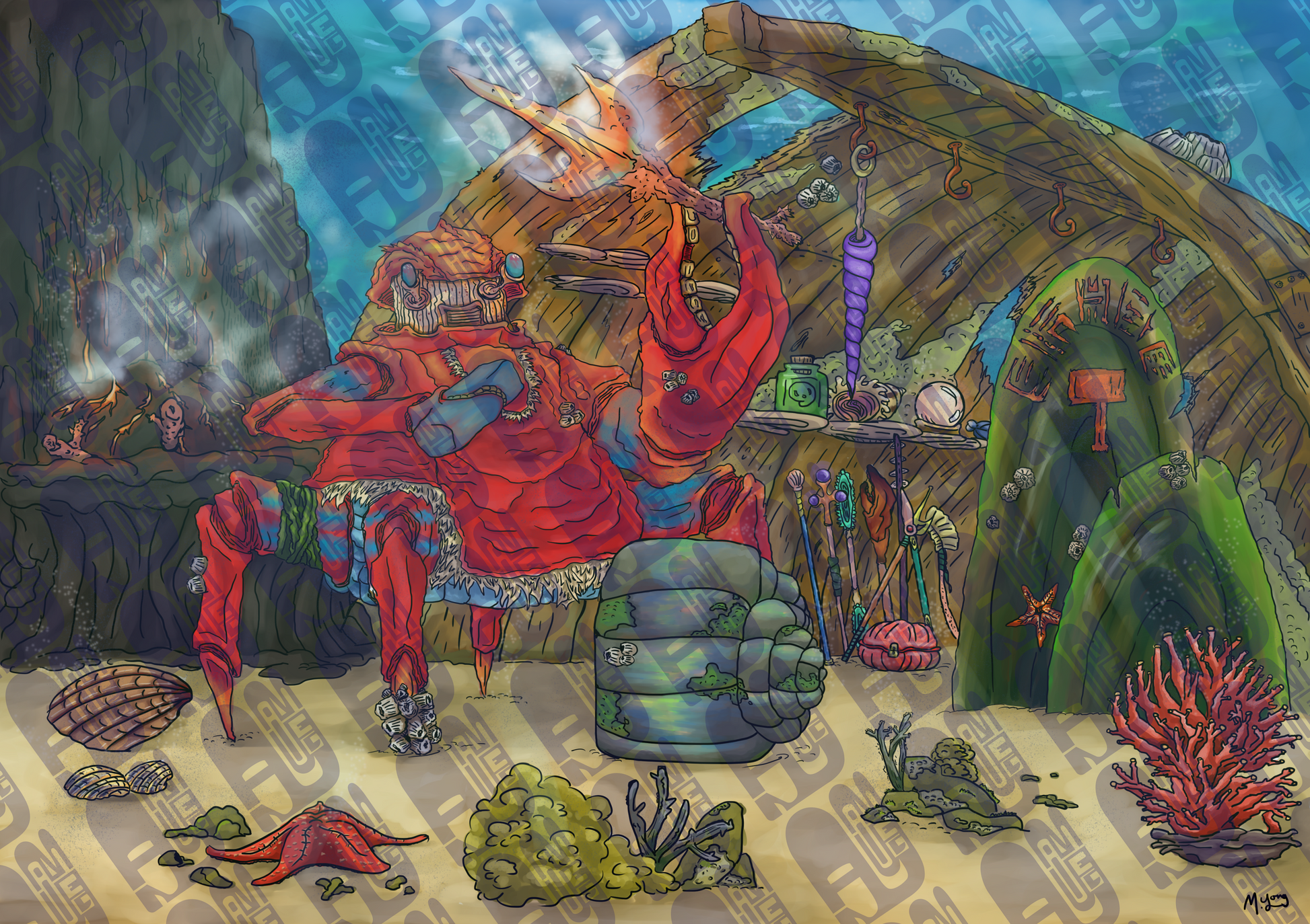 Deep in the ocean depths, a crab smith hammers away with his claw, creating weapons and trinkets for the creatures of the sea.